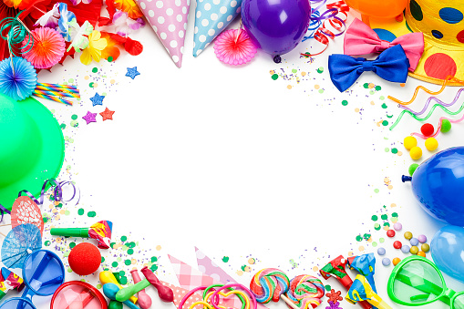 Close Up Shot Of Party Decorations Horn Blowers Streamers Balloons