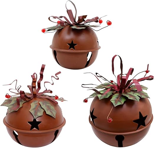 3 15 Inch Large Red Green Brown Jingle Bells Hanging Ornaments