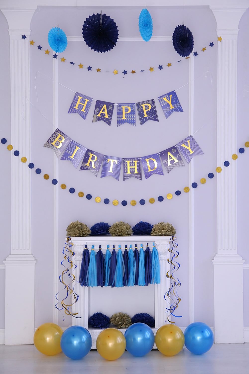 55 Pcs Blue And Gold Birthday Party Decorations Paper Fans